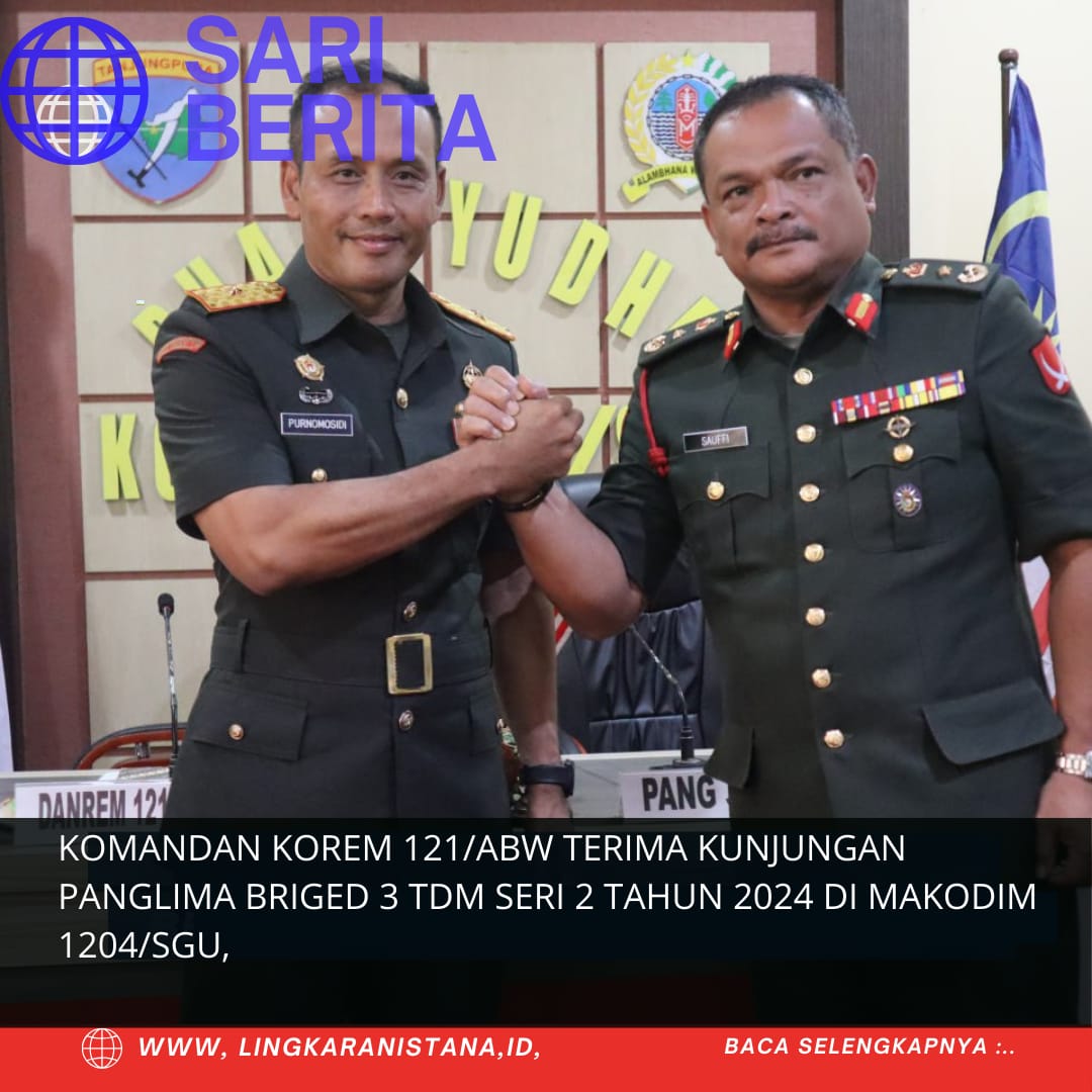 Lingkaranistana.id.SANGGAU – Komandan Korem 121/Abw Brigjen TNI Purnomosidi S.I.P., M.A.P., M.Han Selaku Dankolakopsrem 121/Abw, Terima Kunjungan Panglima Briged 3 TDM seri 2 tahun 2024 dalam rangka “Lawatan Timbal Balas (LTB), yang di laksanakan di Makodim 1204/Sgu Jl.Padi No.01, Kel.Tanjung Kapuas, Kec. Kapuas, Kab.Sanggau Sabtu (18/01/2025).