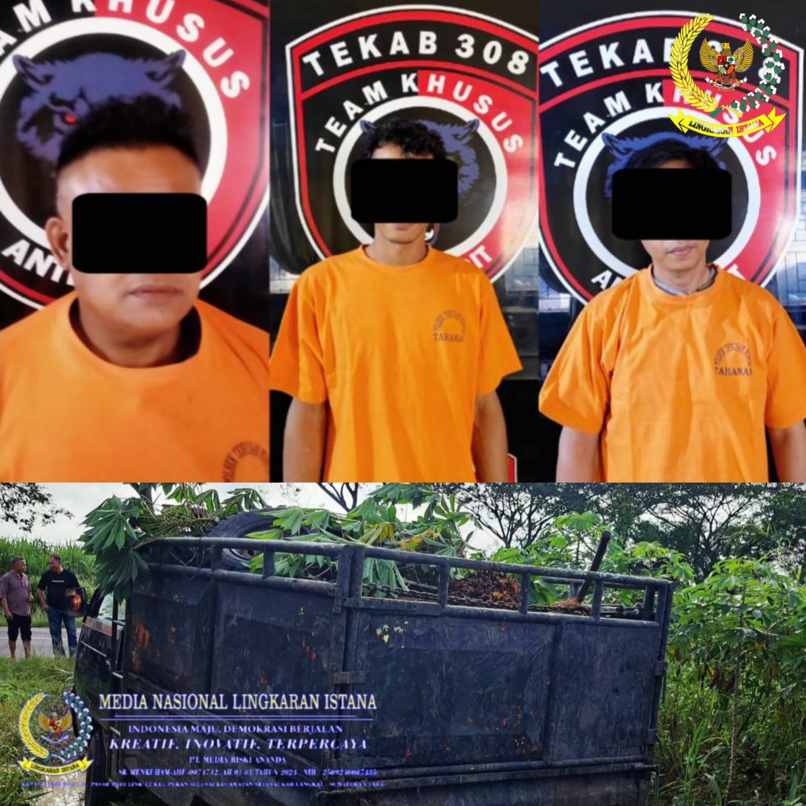 Lampung Tengah Lingkaran istana– Kurang dari 12 jam, Tekab 308 Presisi Polsek Terusan Nunyai berhasil menangkap komplotan pelaku pencurian buah sawit milik Alm Hi. Taher, di Kampung Gunung Agung, Kecamatan Terusan Nunyai, Kabupaten Lampung Tengah, pada Sabtu (18/1/25) sekitar pukul 16.00 WIB.