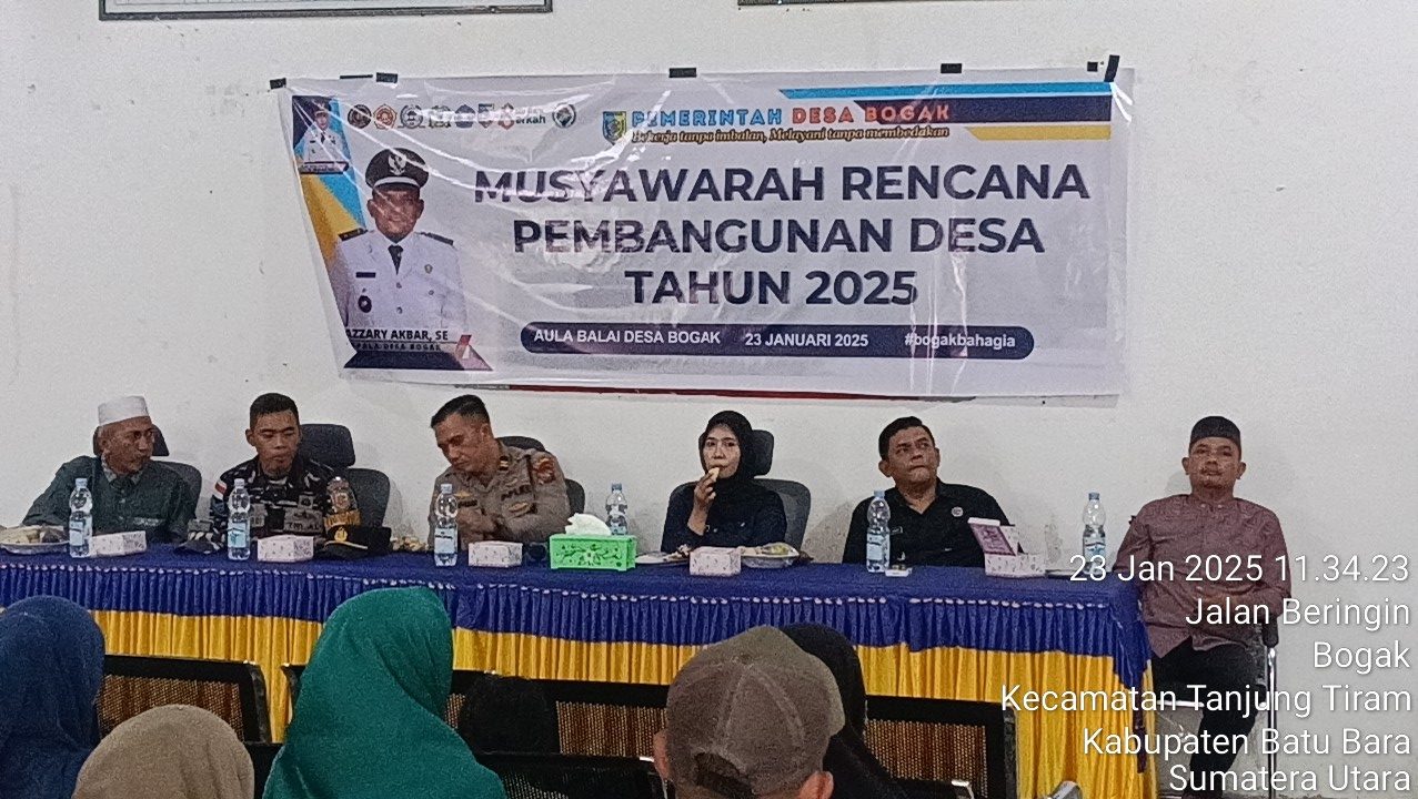 Adapun acara musrembang yang di hadiri oleh, kepala Desa Bogak Fazari Akbar Tanjung, SE, Polsek Labuhan Ruku yang diwakili oleh Ipda Fahmi, Bhabin Potmal AL Tanjung Tiram (Mawardi), Dinas PMD yang diwakilkan, Bhabinkamtibmas Desa Bogak Riad, Tokoh Masyarakat, Tokoh Agama, Tokoh pemuda, Masyarakat dari Desa Bogak, TP PKK Desa Bogak, Karang Taruna Desa Bogak, BPD Desa Bogak, LPM Desa Bogak.