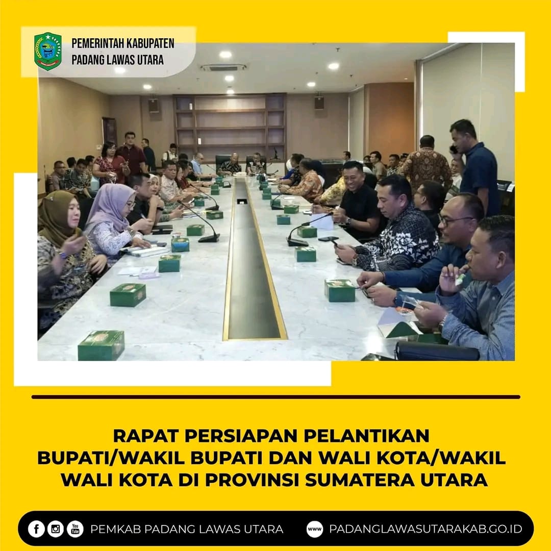 Paluta ,- Lingkaran Istana Penjabat (Pj) Bupati Padang Lawas Utara Patuan Rahmat Syukur P Hasibuan, S.STP., MM., yang diwakili oleh Asisten I Syarifuddin Harahap, S.Sos., MM., menghadiri Rapat Persiapan Pelantikan Bupati/Wakil Bupati dan Wali Kota/Wakil Wali Kota di Provinsi Sumatera Utara di Ruang Rapat I It. 2 Kantor Gubernur Sumatera Utara, JI. P. Diponegoro No. 30 Medan, Jumat (24/01/2025).