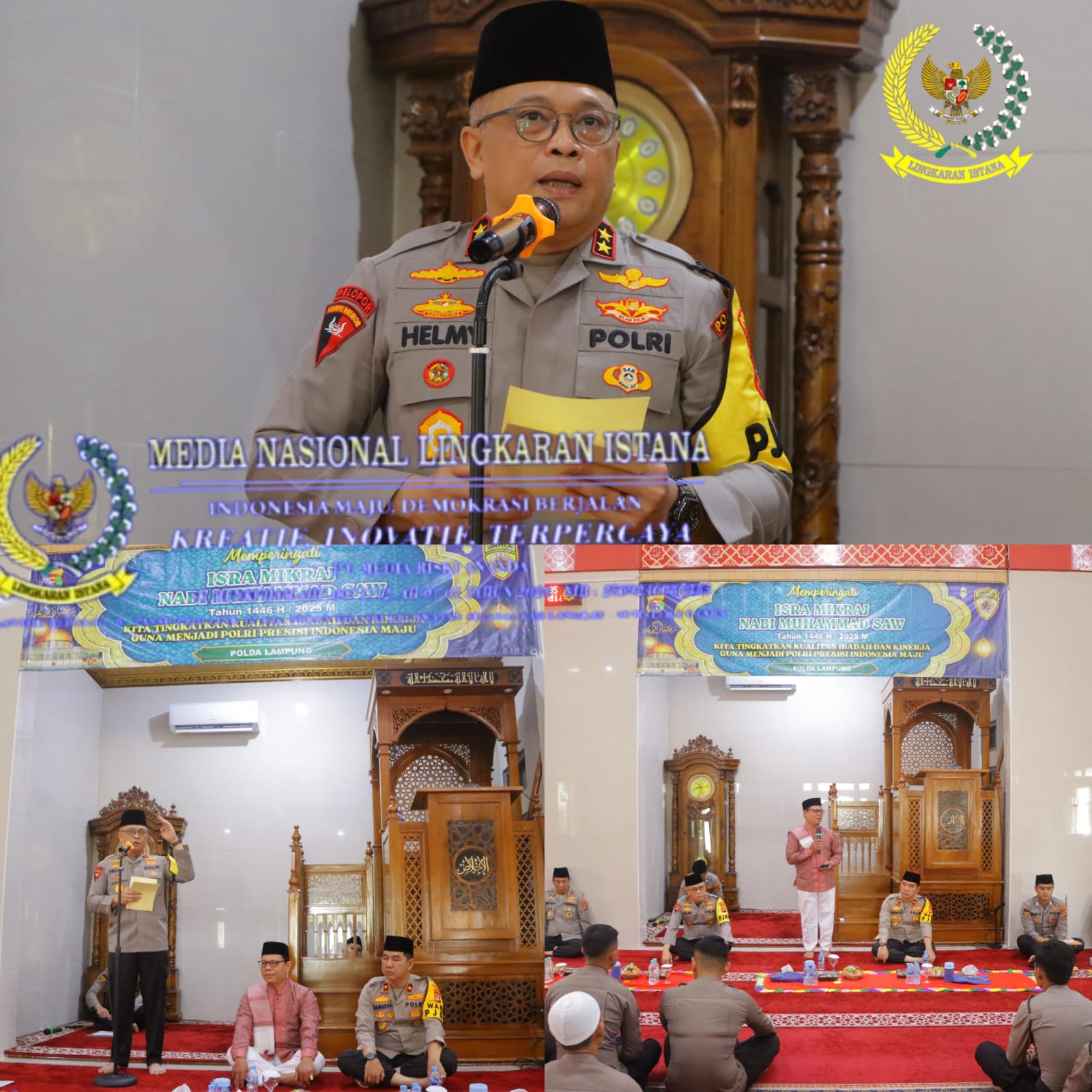 Lampung Lingkaran Istana.id -Kapolda Lampung Irjen Pol Helmy Santika dan Wakapolda Lampung Brigjen Pol Ahmad Ramadhan menghadiri acara Peringatan Isra Mikraj Nabi Muhammad SAW 1446 H/2025 M yang digelar di Masjid Al-Ikhlas Polda Lampung. Acara ini mengusung tema “Kita Tingkatkan Kualitas Ibadah dan Kinerja Guna Menjadi Polri Presisi, Indonesia Maju.” Kamis (13/2/2025)