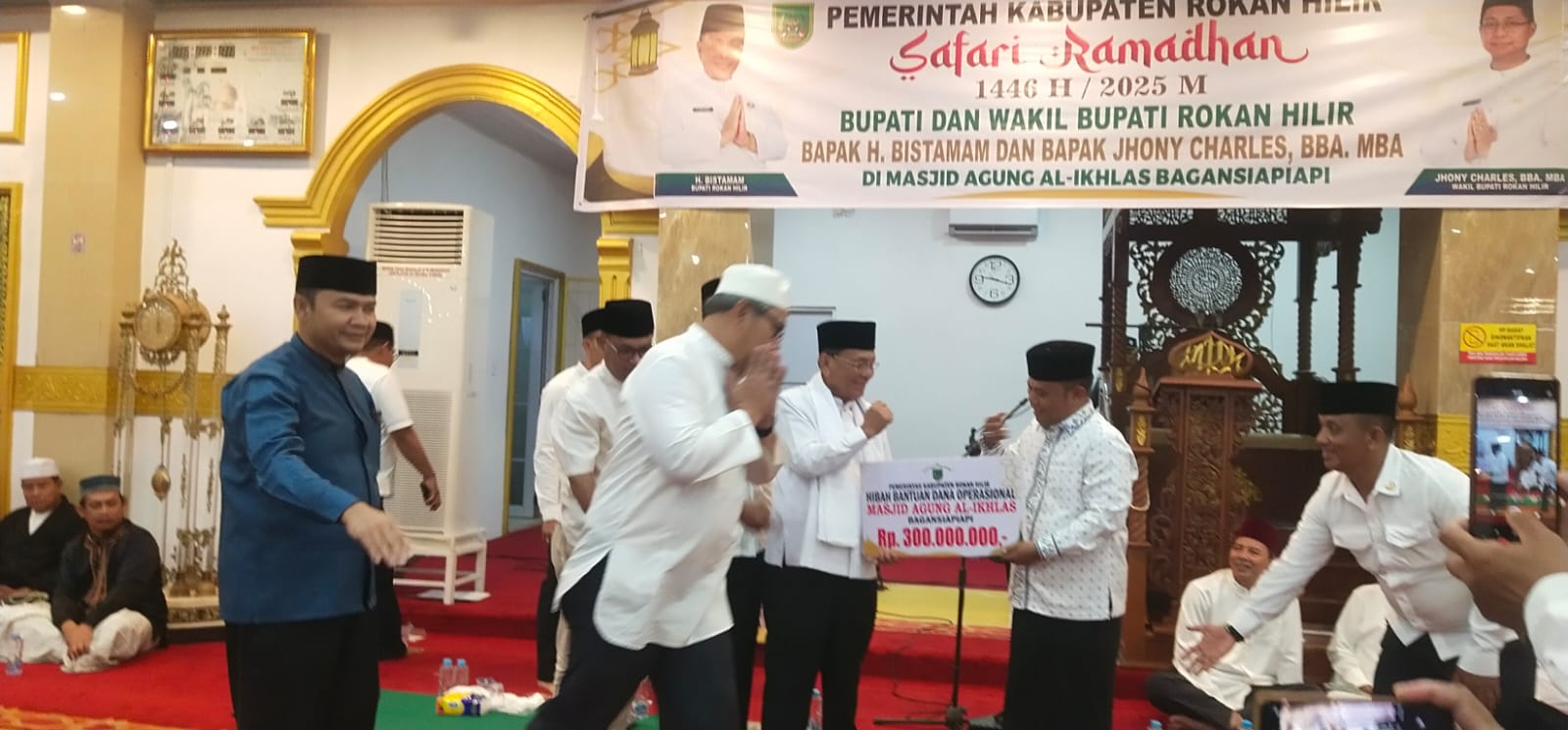 Pada kesempatan tersebut, Bupati Rokan Hilir menyerahkan Dana bantuan Operasional untuk Masjid Agung Al-Ikhlas Bagansiapiapi senilai Rp. 300.000.000,- (Tiga Ratus Juta Rupiah).