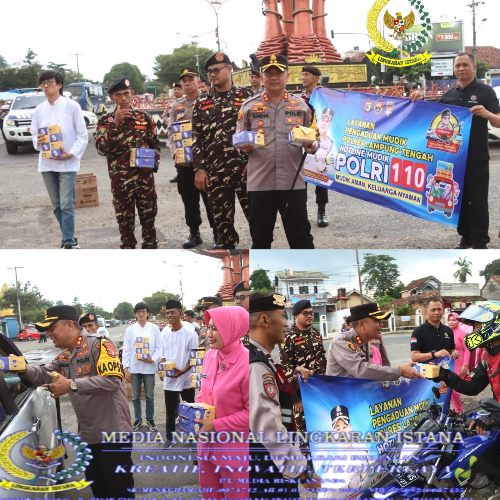 Kegiatan yang berlangsung di simpang Tugu Pepadun, Gunung Sugih menjelang waktu berbuka ini juga dimanfaatkan untuk mensosialisasikan tagline “Mudik Aman, Keluarga Nyaman” serta layanan Kepolisian melalui hotline 110.