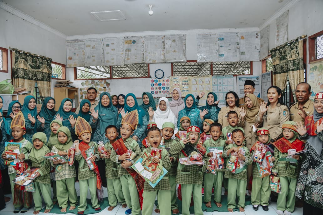 Setelah melakukan peninjauan dan pemberian bingkisan Ny. Titiek Sugiharti Surya bersama Ny. Henny Heridawaty Baharuddin menuju kelas anak PAUD yang disambut dengan penampilan pantun dan tarian oleh anak PAUD. (Rosiah/ilo)