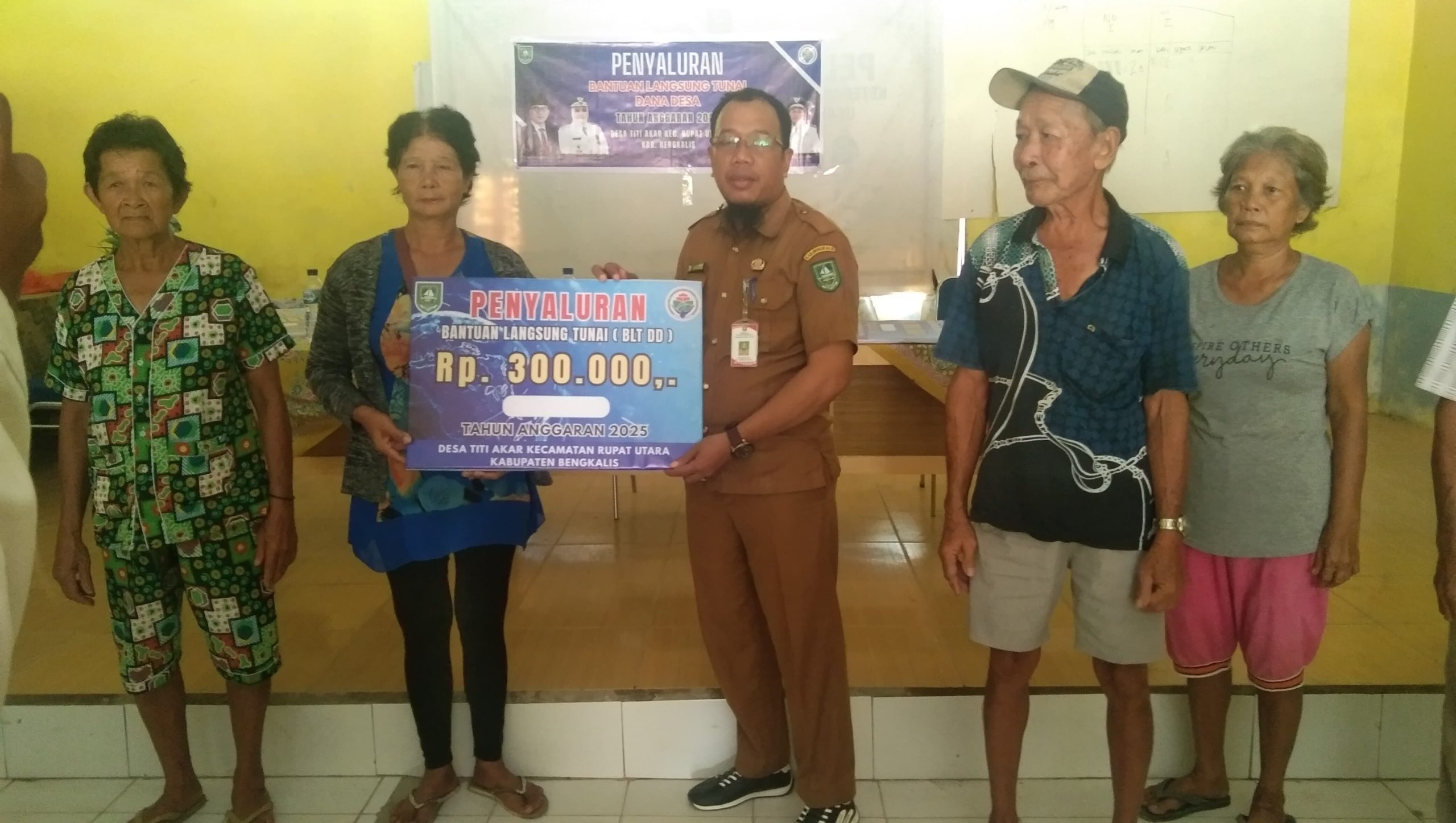 Titi Akar L.i, 28 April 2025 — Bertempat di Aula Kantor Desa Titi Akar, Kecamatan Rupat Utara, Penjabat Kepala Desa (Pj Kades) Titi Akar, Adi Putra, S.Pd.I, secara langsung menyalurkan Bantuan Langsung Tunai Dana Desa (BLT DD) tahun 2025 untuk tahap 1, 2, dan 3 kepada warga penerima manfaat.