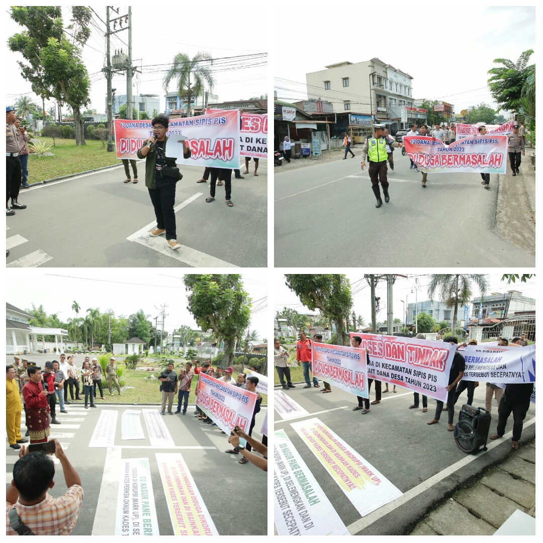 Aksi unjuk rasa koordinator M. Juwanda, menyampaikan bahwa kedatangan mereka bukan untuk mencari sensasi, melaikan menyuarakan dugaan tindak pidana korupsi oleh kepala desa di kecamatan Sipispis dalam orasinya di sebut 12 desa yang diduga melakukan penyelewengan dana desa, di antaranya desa Mariah Nagur, Marubun, Parlambean, Sipispis, buluh duri, Naga Raja Simalas, Nagur Pane, Rimbun dan Gunung Monako.