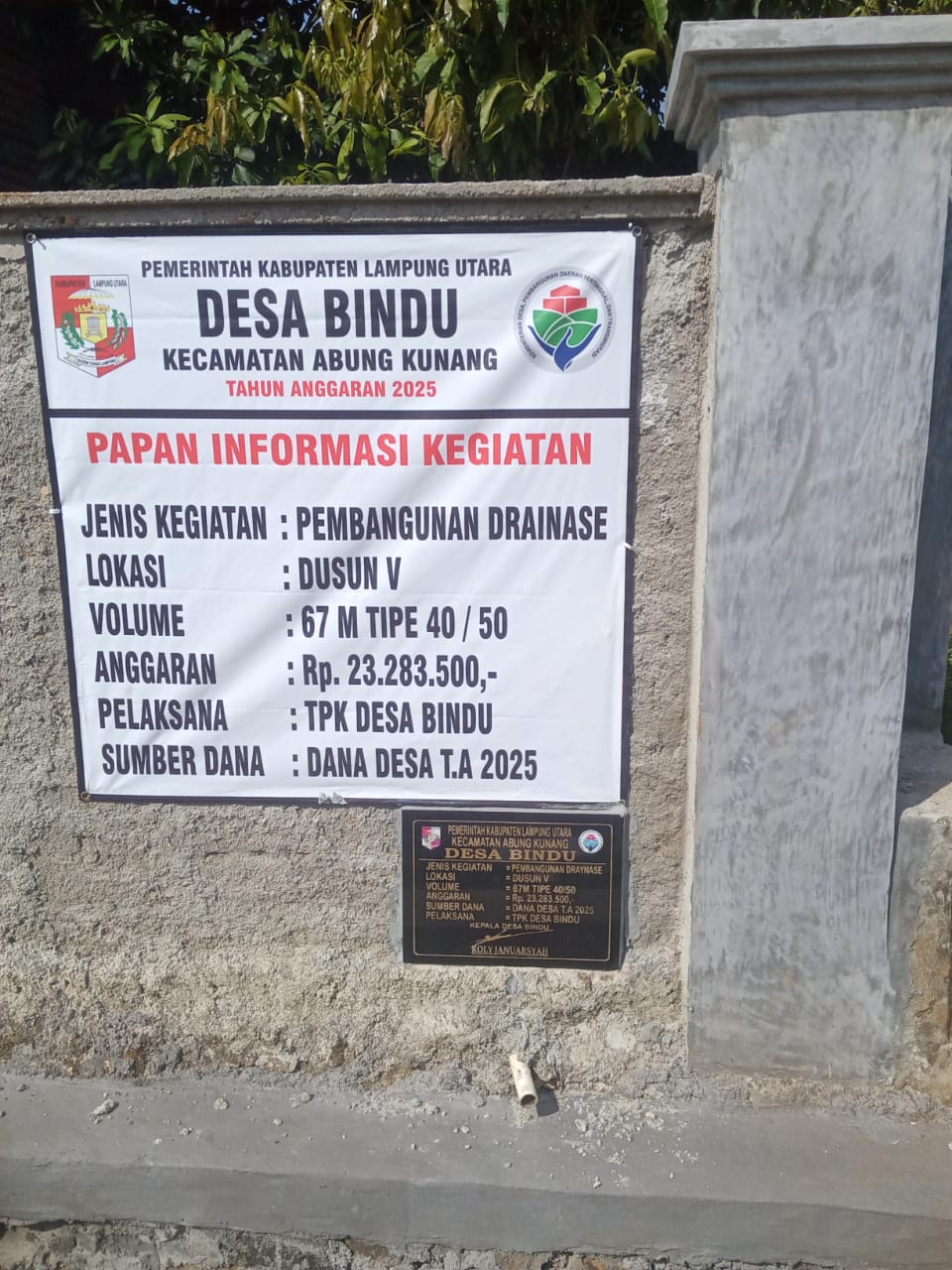 Lampung Utara L.i Pemerintah desa Bindu kecamatan Abung kunang Kabupaten Lampung Utara telah selesai mengerjakan pembangunan drainase dengan menggunakan anggaran dana desa tahap pertama tahun 2025, yang terletak di dusun v desa Bindu kecamatan Abung kunang Kabupaten Lampung Utara dengan volume 67 M TYPE 40/50 dengan anggaran 23.283.500, dengan adanya bangunan DRAINASE ini agar dapat mempermudah saluran genangan air di saat musim hujan.