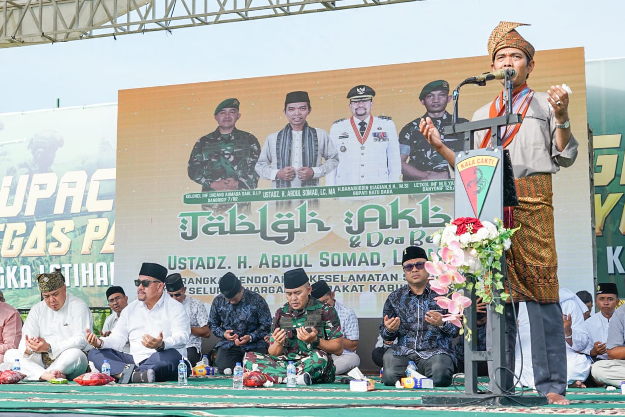 MLi.id- Sumatera Utara, Batu Bara- Dalam rangka mendoakan keselamatan para prajurit kesatuan Yonif 126/ Kala Cakti yang bertugas di Papua, Bupati Batu Bara H. Baharuddin Siagian, SH, M.Si bersama Wakil Bupati Syafrizal, SE, M.AP dan Komandan Brigade Infanteri (Danbrigif) 7/Rimba Raya Letnan Kolonel Inf Dadang Armada Sari, S.I.P. mengikuti Tabligh Akbar bersama ustadz kondang Ustadz Abdul Somad (UAS).