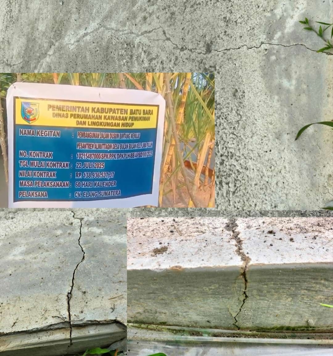MLi.id- Sumatra Utara, Batubara- Proyek pembangunan jalan rabat beton yang dikerjakan Dinas Perumahan Kawasan Permukiman dan Lingkungan Hidup (Perkim-LH) Kabupaten Batu Bara menuai sorotan tajam. Jalan rabat beton yang berlokasi di Dusun I Bintang menuju Pesantren Al Muttaqin, Desa Bulan-Bulan, Kecamatan Lima Puluh Pesisir, Kabupaten Batu Bara, kini sudah retak meski baru sebulan selesai dikerjakan, Selasa (09/09/2025).