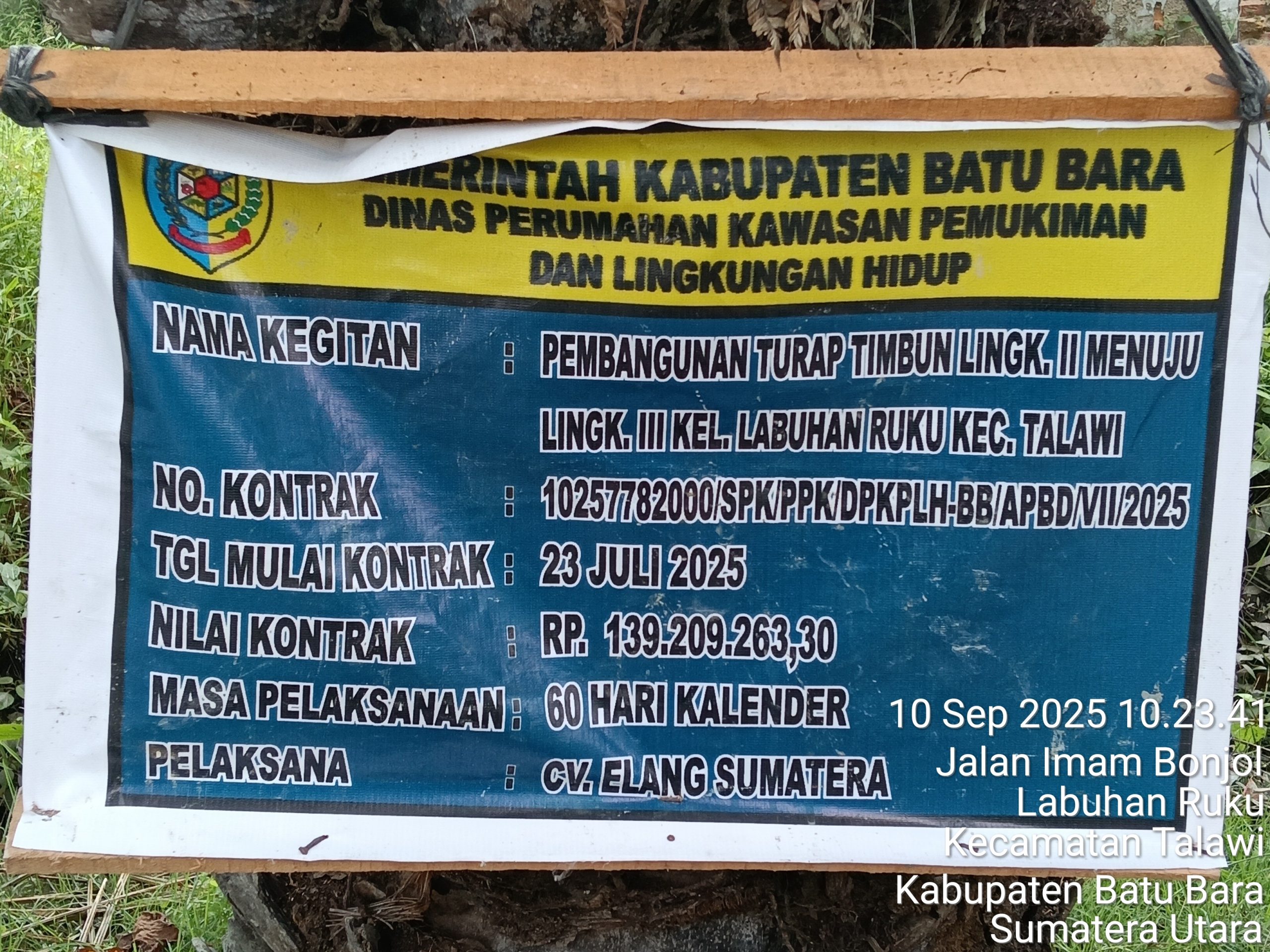 Informasi di papan proyek menyebutkan, Pemerintah Kabupaten Batubara Dinas Perumahan Kawasan Permukiman dan Lingkungan Hidup, menyalurkan kegiatan pembangunan turap timbun, dari Lingkungan ll menuju ke lingkungan lll di kelurahan Labuhan Ruku Kecamatan Talawi, dengan nomor kontrak pekerjaan, 10257782000/SPK/PPK//DPKPLH-BB/APBD/VII/2025, yang mana memiliki masa pekerjaan selama 60 hari kalender sejak 23 Juli 2025, namun, hingga Rabu (10/9/2025), progres di lapangan masih jauh dari harapan masyarakat.