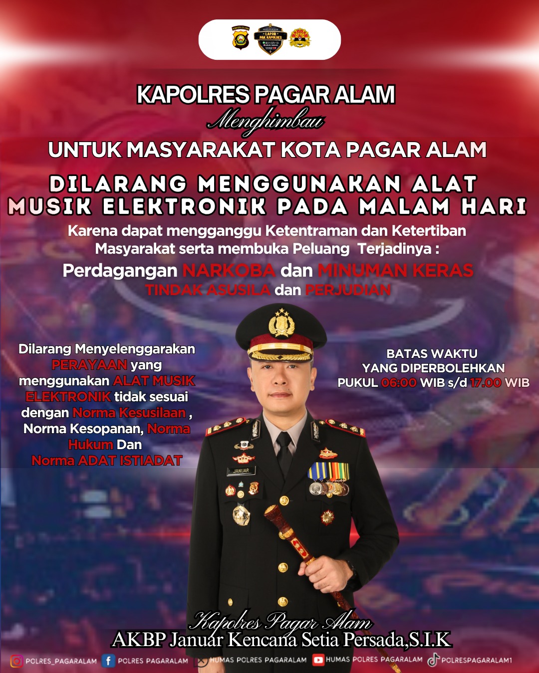 lingkaranistana.id Pagaralam – Kapolres Pagaralam AKBP Januar Kencana Setia Persada, S.I.K mengeluarkan imbauan tegas kepada seluruh masyarakat Kota Pagaralam untuk tidak menggunakan alat musik elektronik pada malam hari. Langkah ini dilakukan guna menjaga ketentraman dan ketertiban masyarakat di lingkungan sekitar.