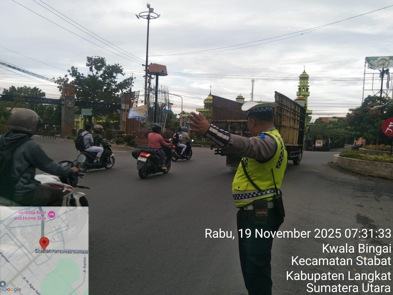 Langkat-lingkaran istana . Untuk memastikan kelancaran arus Lalulintas 200 Personil Polres Langkat dan jajaran melaksanakan pos padat pagi (strong point) di Wilkum Polres Langkat, Rabu (19/11/2025). 07.00 WIB.
