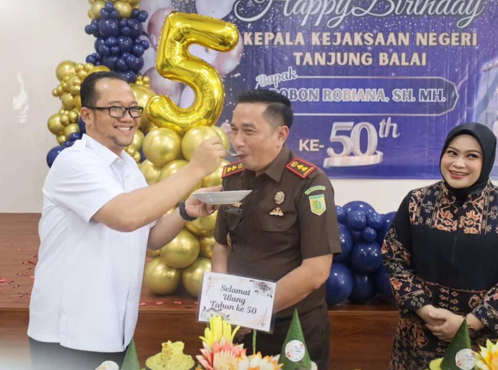 “Selamat ulang tahun, sukses selalu usia ke 50. Kejutan ini bentuk kebersamaan Forkompinda Kota Tanjungbalai dalam kebersamaan, kolaborasi sinergitas yang akan terus dibangun dalam wujudkan Visi Tanjungbalai EMAS,” ucap Wakil Wali Kota Tanjungbalai.