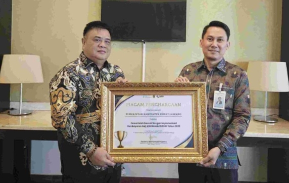 Piagam penghargaan ini diberikan kepada Pemerintah Daerah Kabupaten Empat Lawang, sebagai Pemerintah Daerah Dengan Implementasi Pembayaran Gaji ASN Melalui SIPD Tahun 2025.