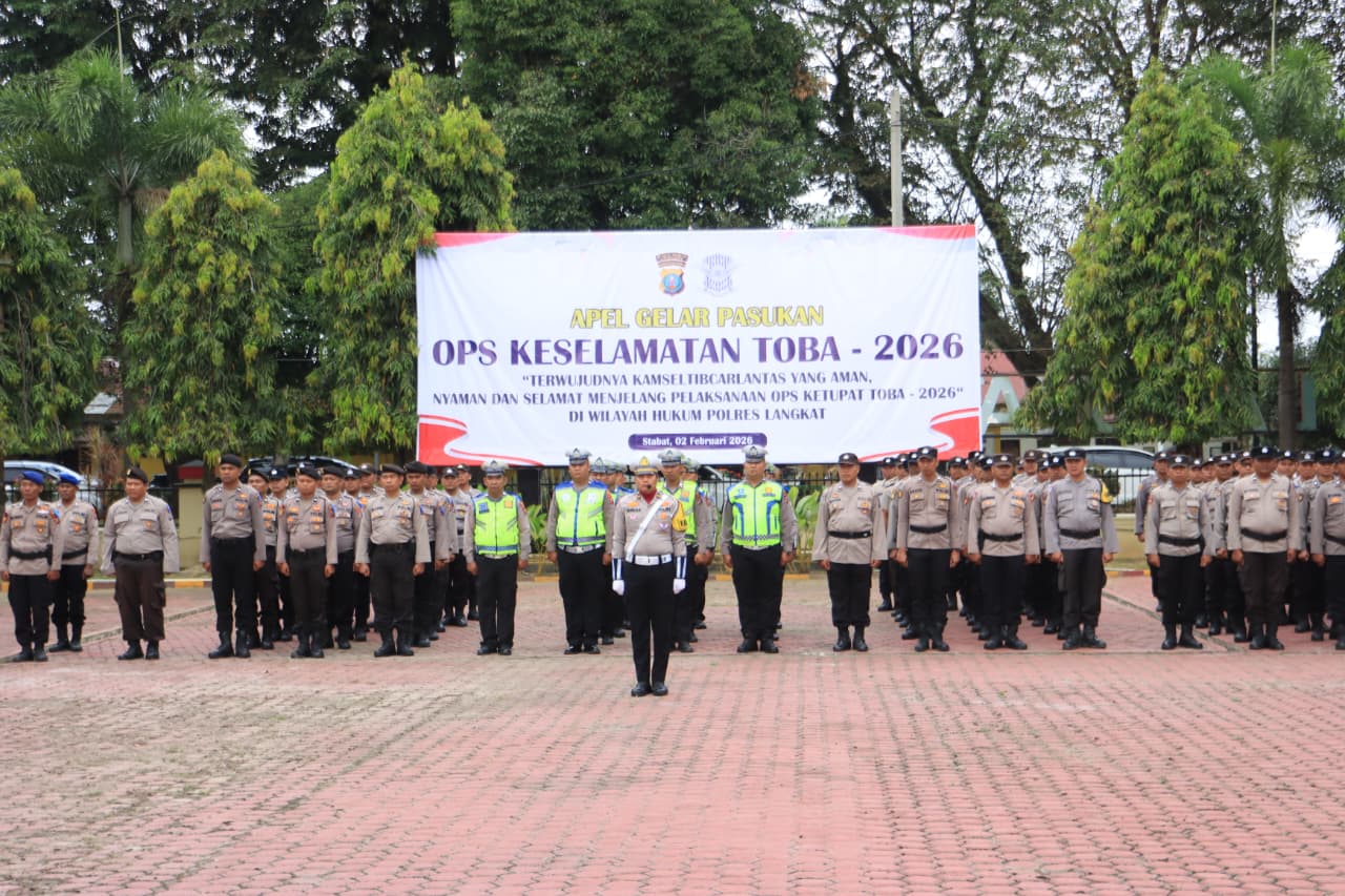 Langkat — Li.id Polres Langkat menggelar Apel Gelar Pasukan Operasi Kepolisian Kewilayahan “Keselamatan Toba 2026” di Lapangan Jananuraga Polres Langkat, Senin (2/2/2026). Apel ini menjadi penanda kesiapan seluruh unsur terkait dalam mendukung upaya peningkatan keamanan, keselamatan, ketertiban, dan kelancaran lalu lintas (Kamseltibcarlantas) menjelang Hari Raya Idul Fitri 1447 Hijriah. Senin (2/2/26)