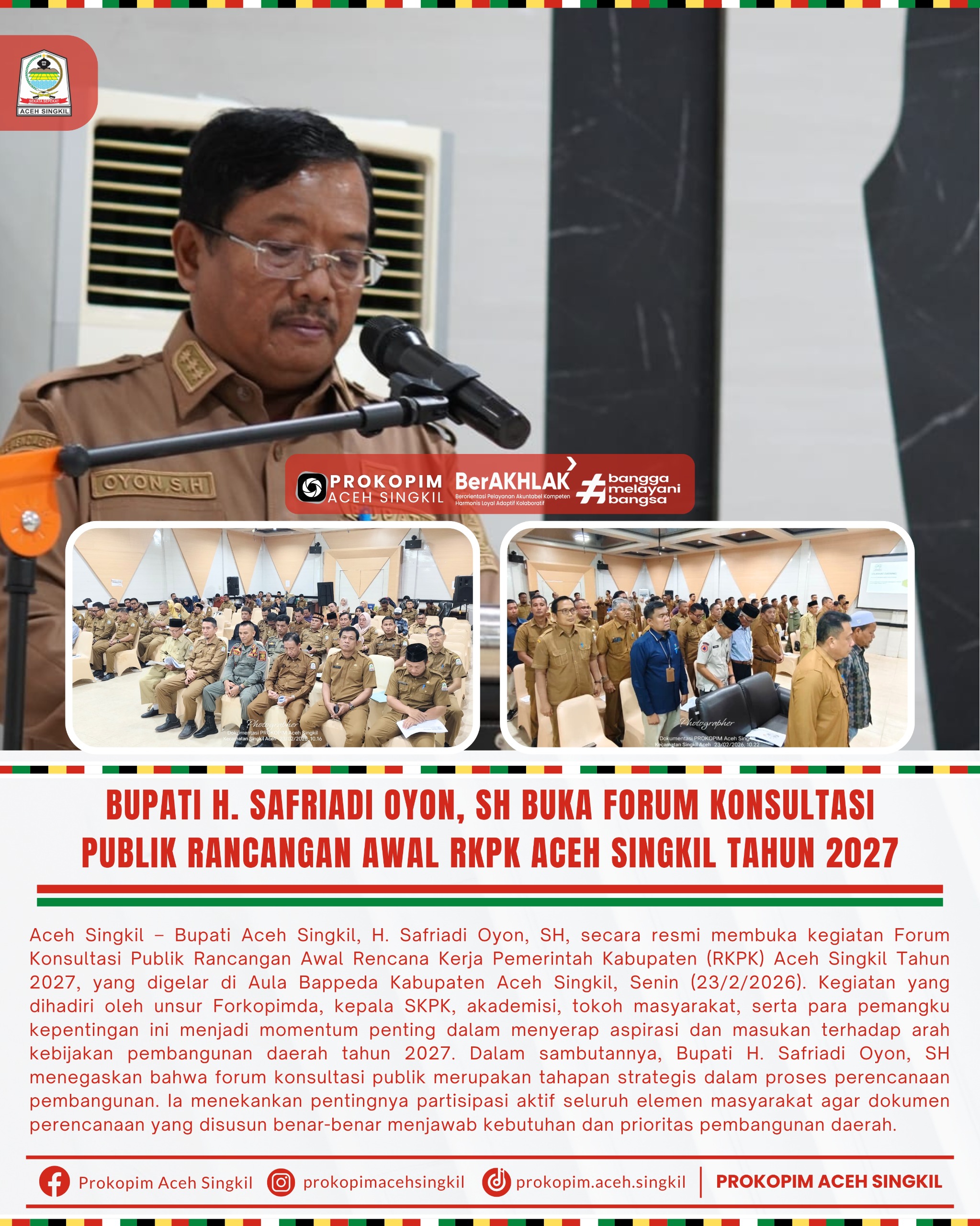 Bupati Aceh Singkil H.Safriadi Oyon,SH Buka Forum Konsultasi Publik Rancangan Awal RKPK Aceh Singkil Tahun 2027.