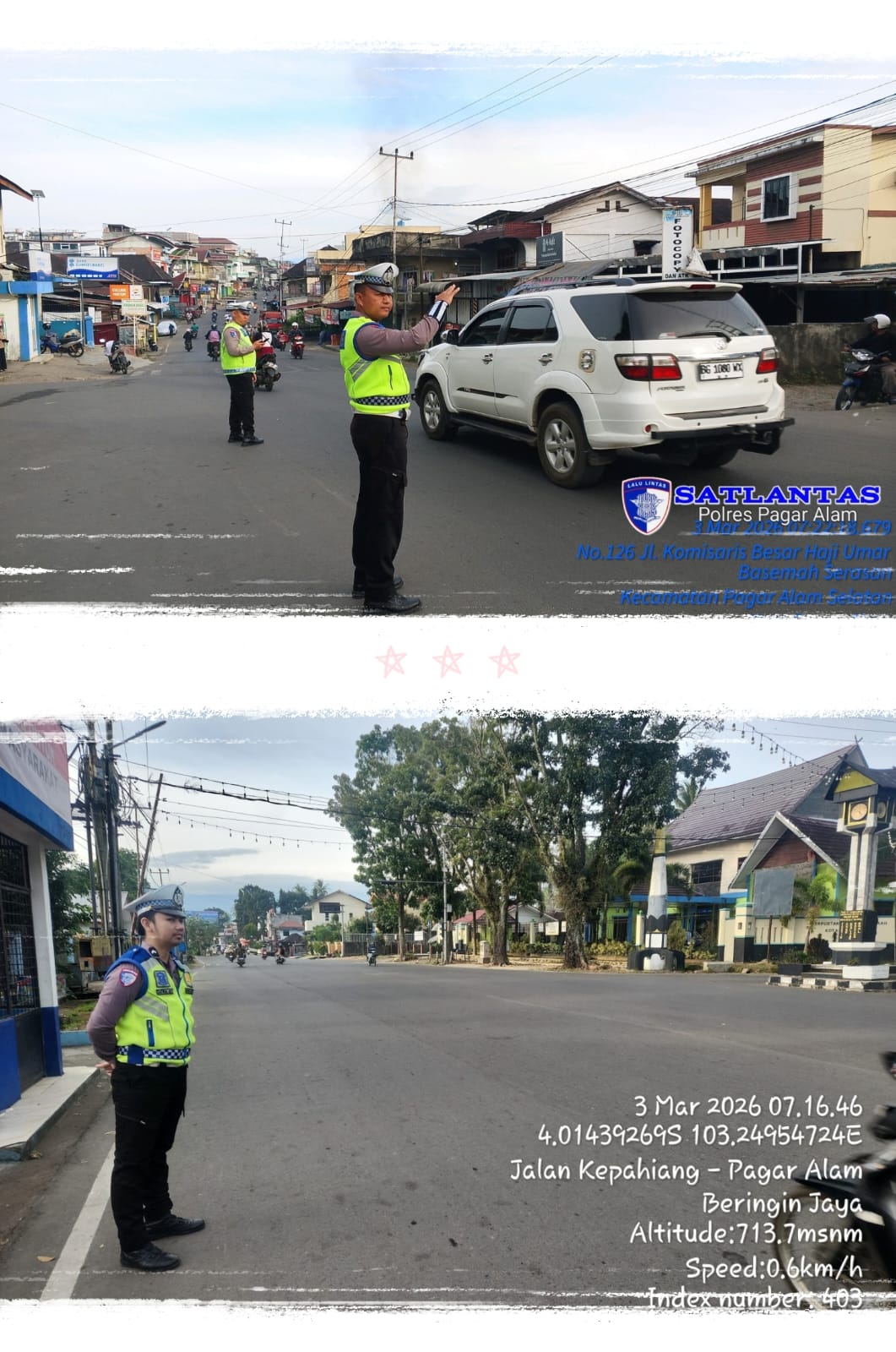Pagaralam – Satuan Lalu Lintas Polres Pagar Alam melaksanakan kegiatan strong point pagi pada Selasa (3/3/2026) di bulan suci Ramadhan 1447 Hijriah. Kegiatan ini dipimpin Kasat Lantas AKP Herman. SH bersama personel Satlantas.