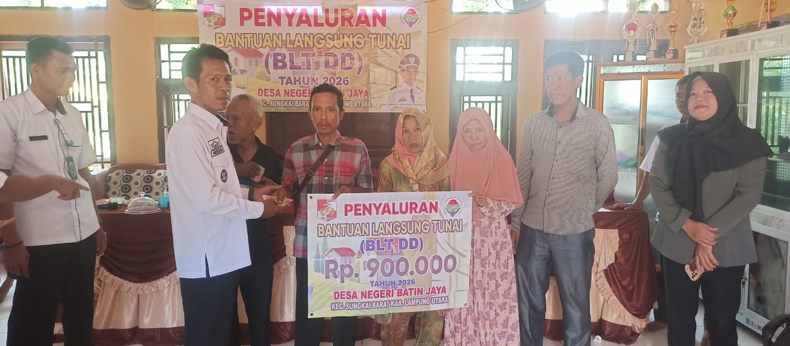 Lampung Utara Lingkaran istana  Pemerintah desa negri batin jaya kecamatan sungkai barat kabupaten Lampung Utara bagikan langsung blt dd tahap pertama tahun 2026 secara simbolis kepada 5 KPM selama tiga bln dari Januari sampai Maret sebesar 300rb perbulan dengan total 900 ribu rupiah, acara di gelar di balai desa negri batin jaya kecamatan sungkai barat kabupaten Lampung Utara Rabu 22 April 2026.